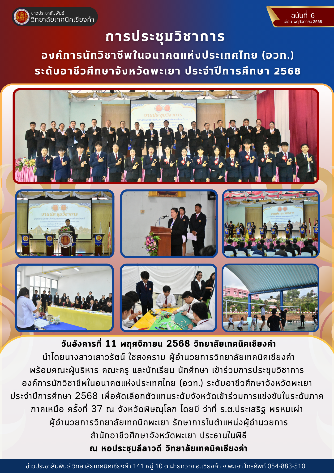 นำโดยนางสาวเสาวรัตน์ ใชสงคราม ผู้อำนวยการวิทยาลัยเทคนิคเชียงคำ พร้อมคณะผู้บริหาร คณะครู และนักเรียน นักศึกษา เข้าร่วมการประชุมวิชาการ  องค์การนักวิชาชีพในอนาคตแห่งประเทศไทย (อวท.) ระดับอาชีวศึกษาจังหวัดพะเยา  ประจำปีการศึกษา 2568 เพื่อคัดเลือกตัวแทนระดับจังหวัดเข้าร่วมการแข่งขันในระดับภาค  ภาคเหนือ ครั้งที่ 37 ณ จังหวัดพิษณุโลก โดยมี ว่าที่ ร.ต.ประเสริฐ พรหมเผ่า  ผู้อำนวยการวิทยาลัยเทคนิคพะเยา รักษาการในตำแหน่งผู้อำนวยการ สำนักอาชีวศึกษาจังหวัดพะเยา ประธานในพิธี