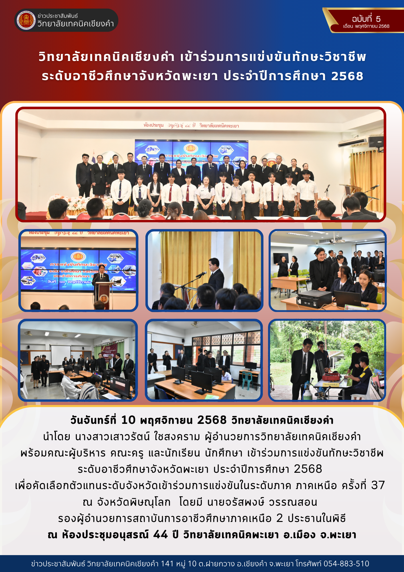 นำโดย นางสาวเสาวรัตน์ ใชสงคราม ผู้อำนวยการวิทยาลัยเทคนิคเชียงคำ พร้อมคณะผู้บริหาร คณะครู และนักเรียน นักศึกษา เข้าร่วมการแข่งขันทักษะวิชาชีพ ระดับอาชีวศึกษาจังหวัดพะเยา ประจำปีการศึกษา 2568  เพื่อคัดเลือกตัวแทนระดับจังหวัดเข้าร่วมการแข่งขันในระดับภาค ภาคเหนือ ครั้งที่ 37  ณ จังหวัดพิษณุโลก  โดยมี นายจรัสพงษ์ วรรณสอน  รองผู้อำนวยการสถาบันการอาชีวศึกษาภาคเหนือ 2 ประธานในพิธี