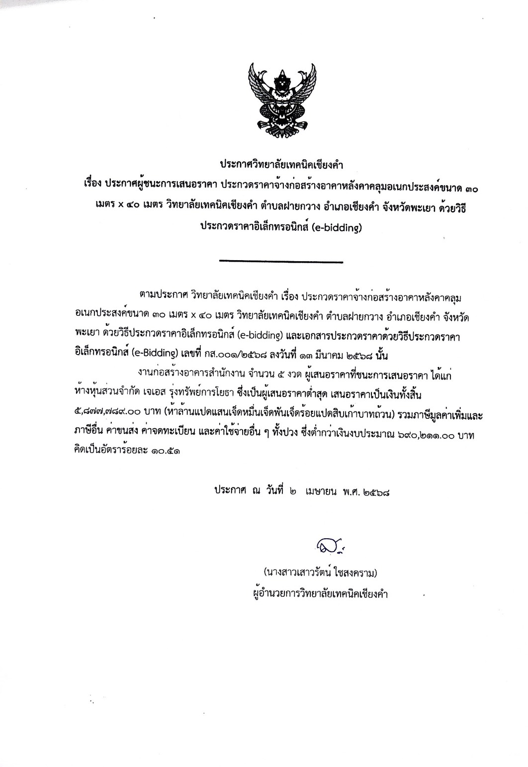 ประกาศผู้ชนะการเสนอราคา ประกวดราคาจ้างก่อสร้างอาคารหลังคาคลุมอเนกประสงค์ขนาด 30x40เมตร วิทยาลัยเทคนิคเชียงคำ